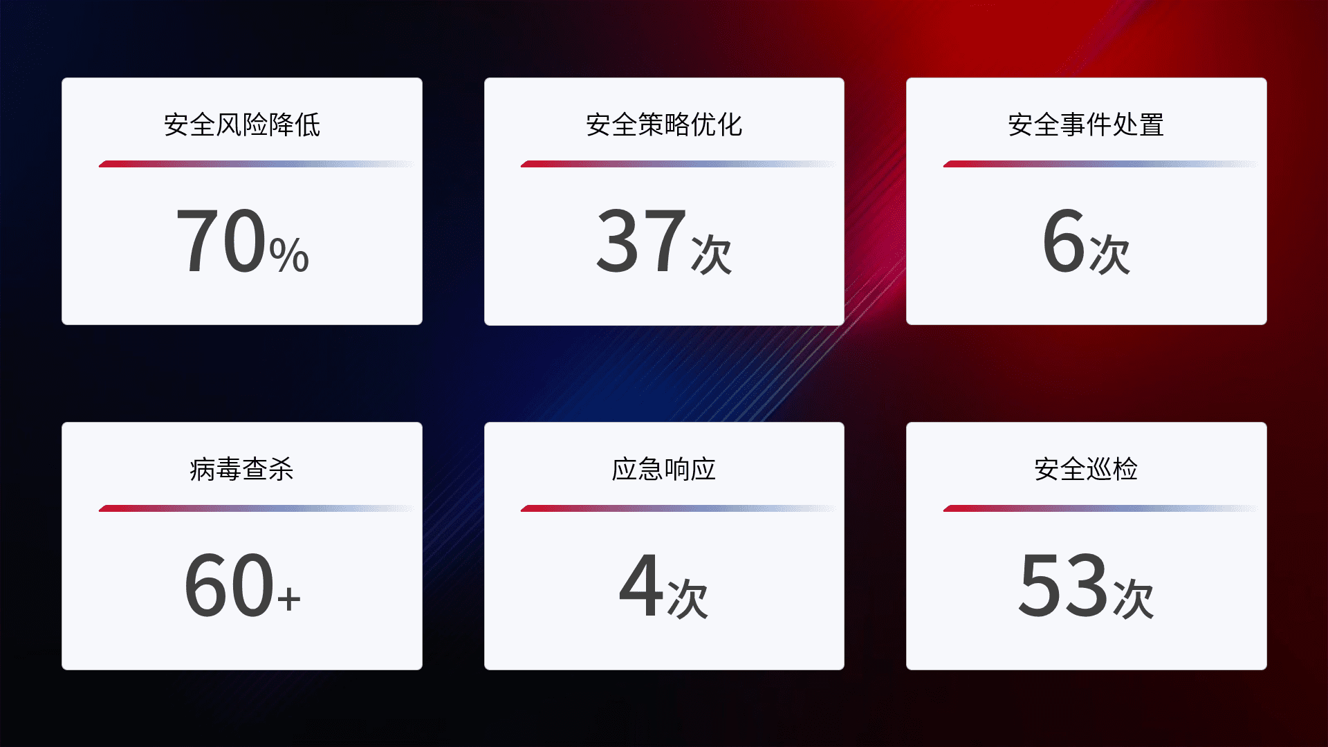 提供全面的安全事件报告体系,,,,包括处置报告、、、周报、、季度和年度总结,,,结合持续监控,,,帮助客户深入了解网络安全状况。。。。