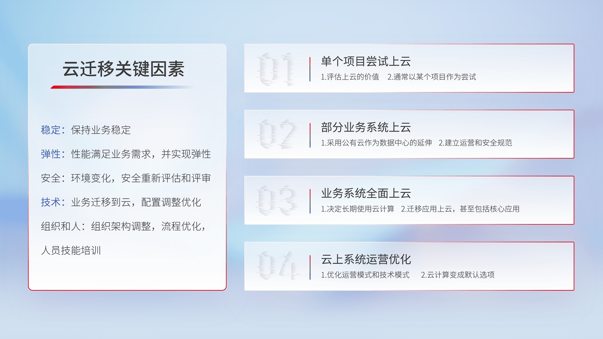 结合实际业务,,从规划设计、、云平台选型、、、、云原生改造、、数据迁移、、、集成交付,,,迁移全过程为客户识别最佳上云路径,,,做好风险识别管理,,,,设计网络架构、、身份权限、、、、安全审计合规、、、操作审计、、、日志审计、、、、监控告警策略、、、、多站点容灾设计等,,对云上基础设施进行整体规划,,提升IT治理水平,,,以满足弹性、、、、高可用、、高性能的需求。。。