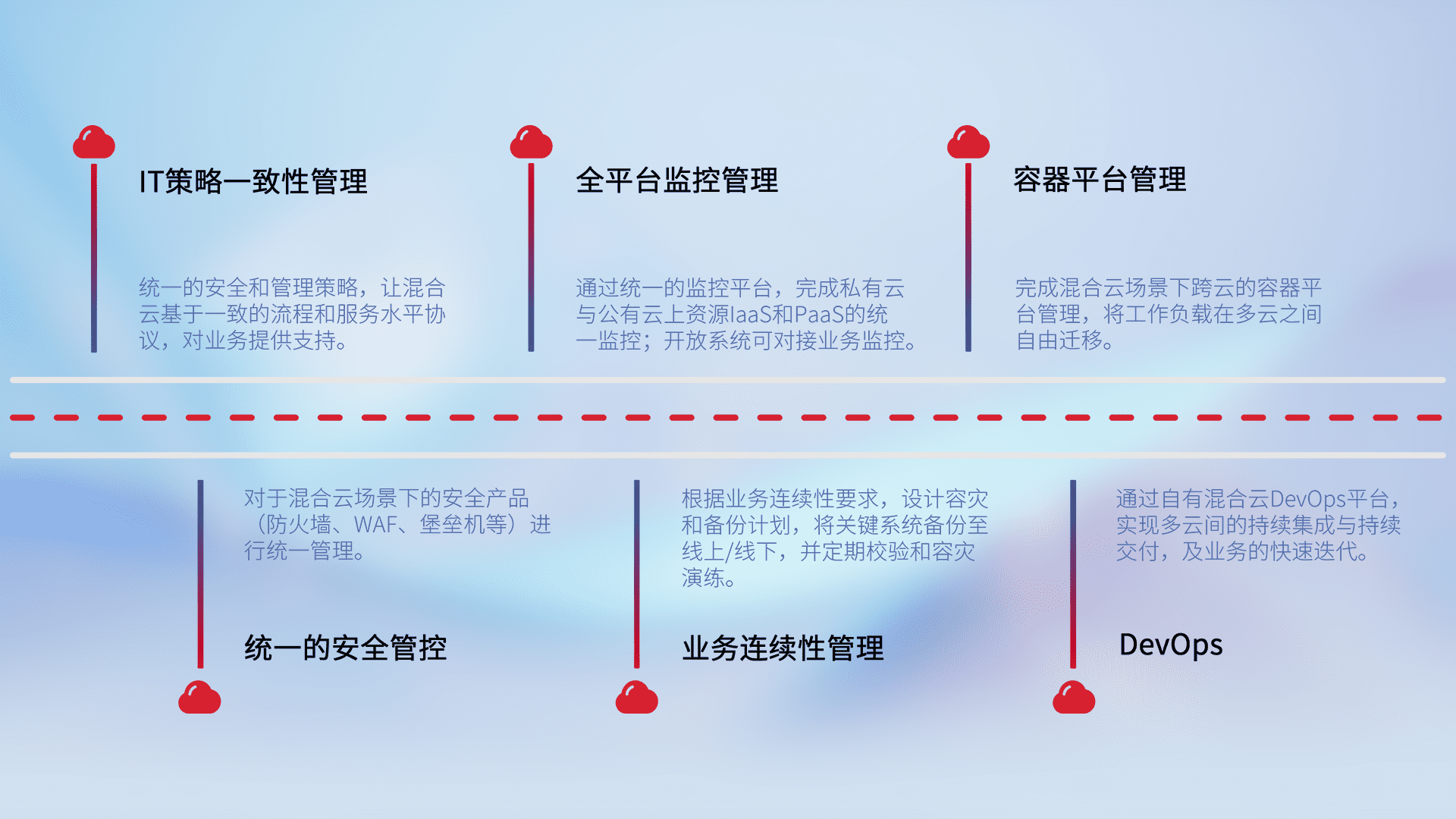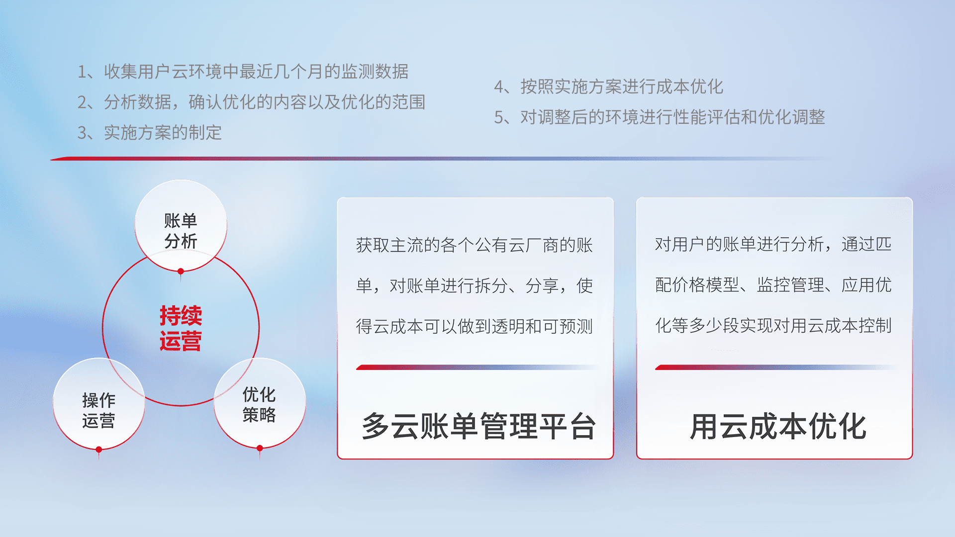 通过多云纳管,,,,以统一的资源数据模型把客户的云资源进行抽象和封装,,,,进而实现对多云资源的统一操作,,保障云资源管理的可靠性、、、、稳定性与可用性。。量身定制化运维内容,,,,配置、、、开发运维、、补丁管理、、备份、、监控、、认证和访问管理、、、审计和日常巡检等,,保障在用云过程中的可靠度,,,,稳定度以及高可用率。。。